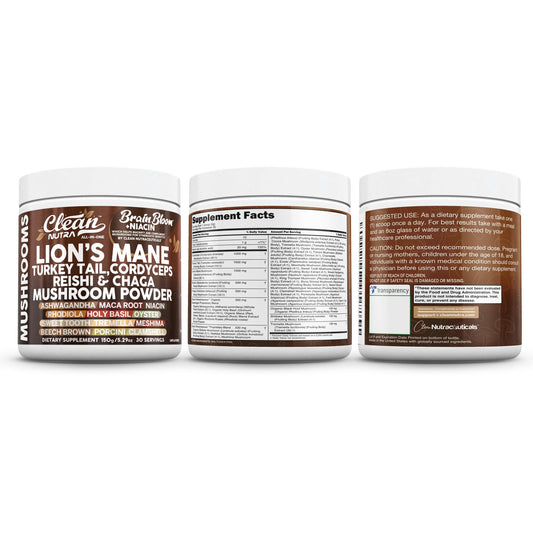 Clean Nutra Lion's Mane Turkey Tail Cordyceps Reishi Chaga Mushroom Powder + Ashwagandha Niac...