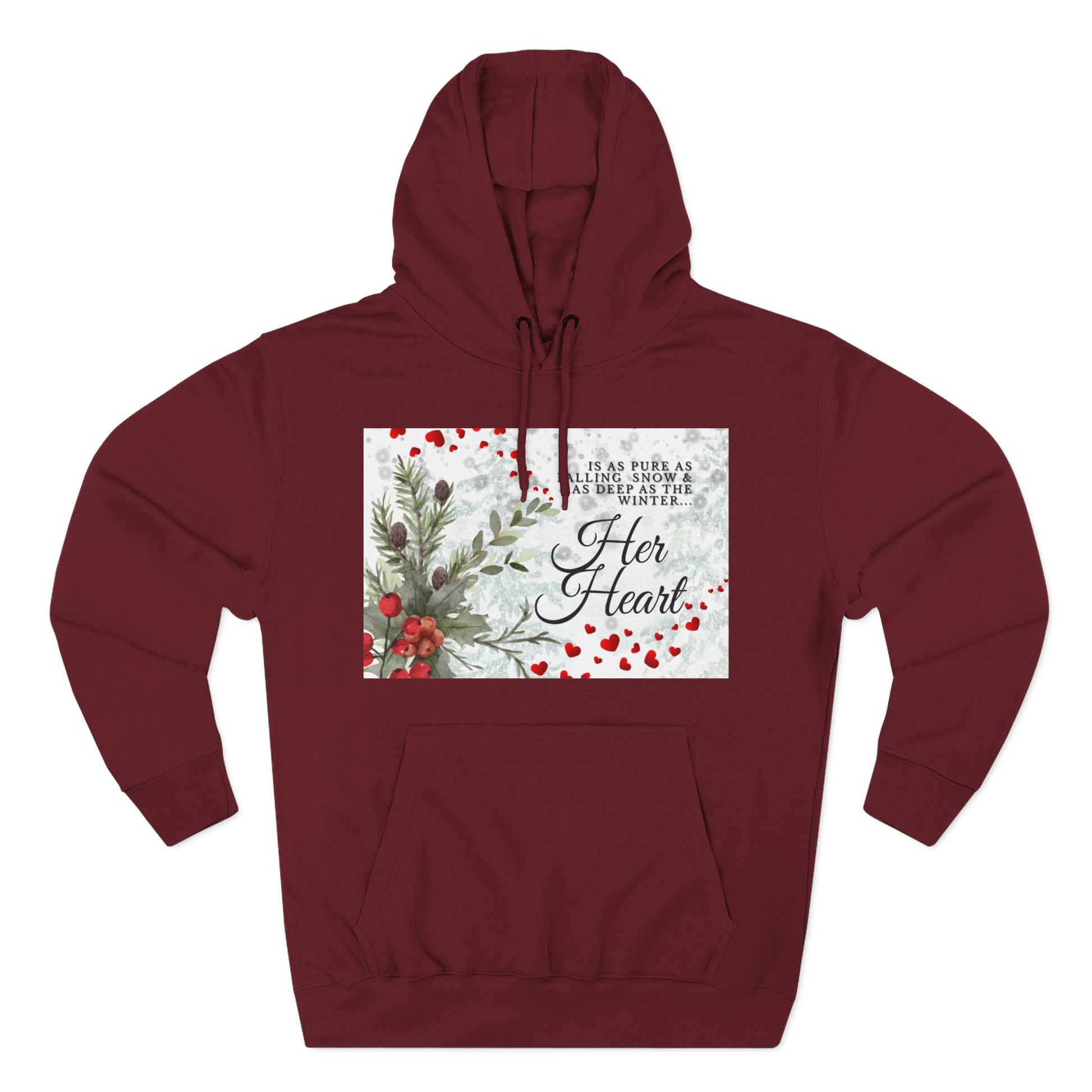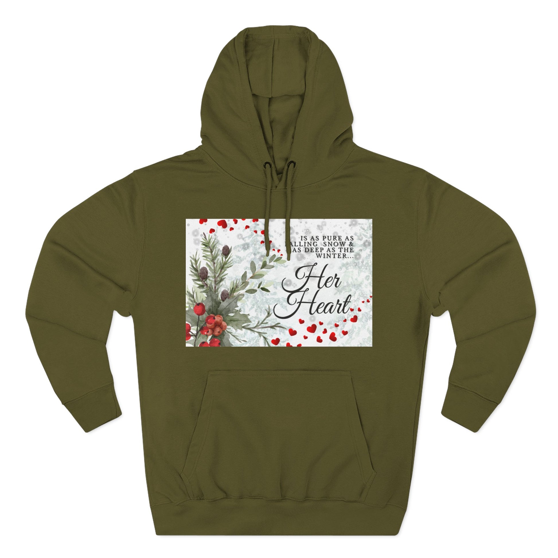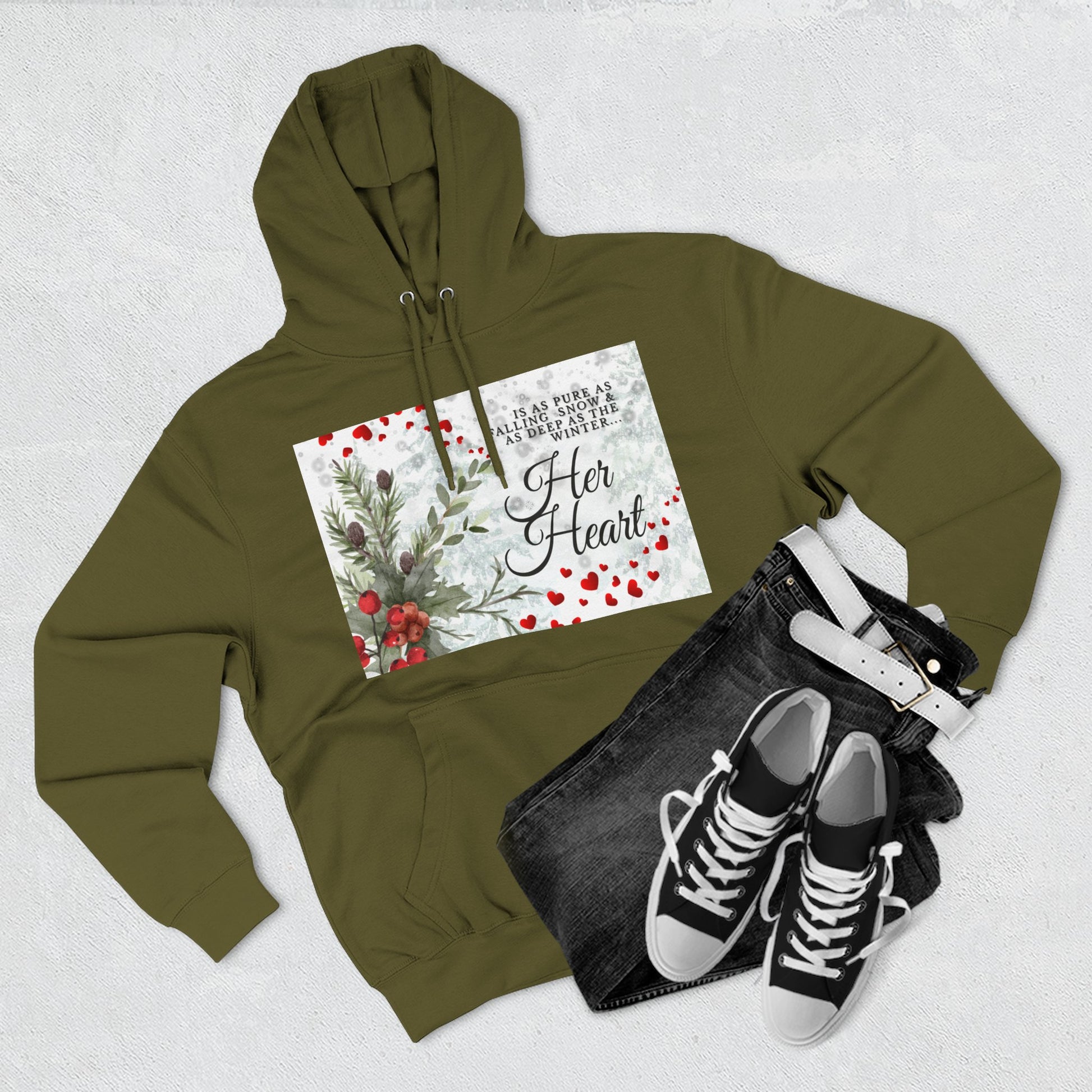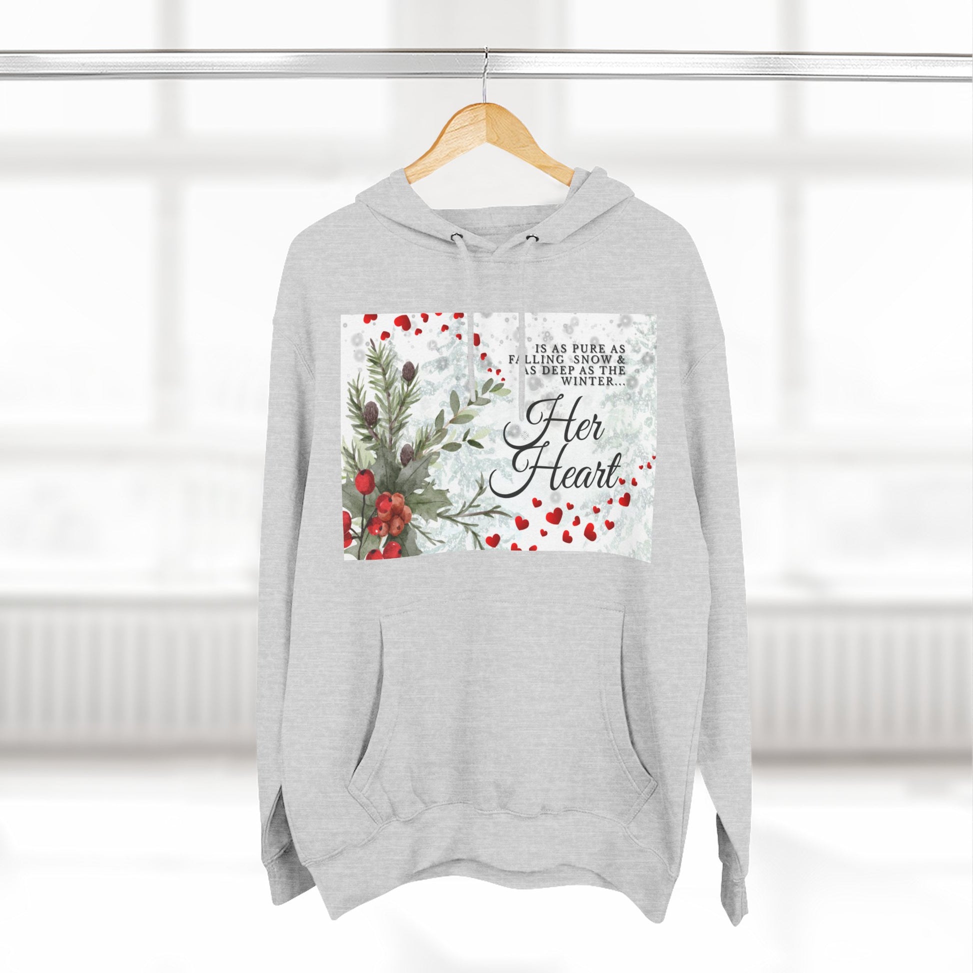 Her Heart Winter Hoodie wraps quiet strength in a soft, close-to-skin warmth. This hoodie feels like a slow exhale on a frost-bright morning — steady, intimate, and quietly brave. The roomy kangaroo pocket is a place to tuck chilled hands or a crumpled note; the adjustable hood forms a gentle shelter when the wind presses in. Embroidered details sit low and deliberate on the chest, a small emblem of resilience that reads like a private affirmation rather than a shout. It layers easily under a coat for woods-side walks and stands alone for cottage evenings by the window. For anyone who carries courage in subtle gestures, this hoodie becomes part of how they move through the season: warm, composed, and quietly present.