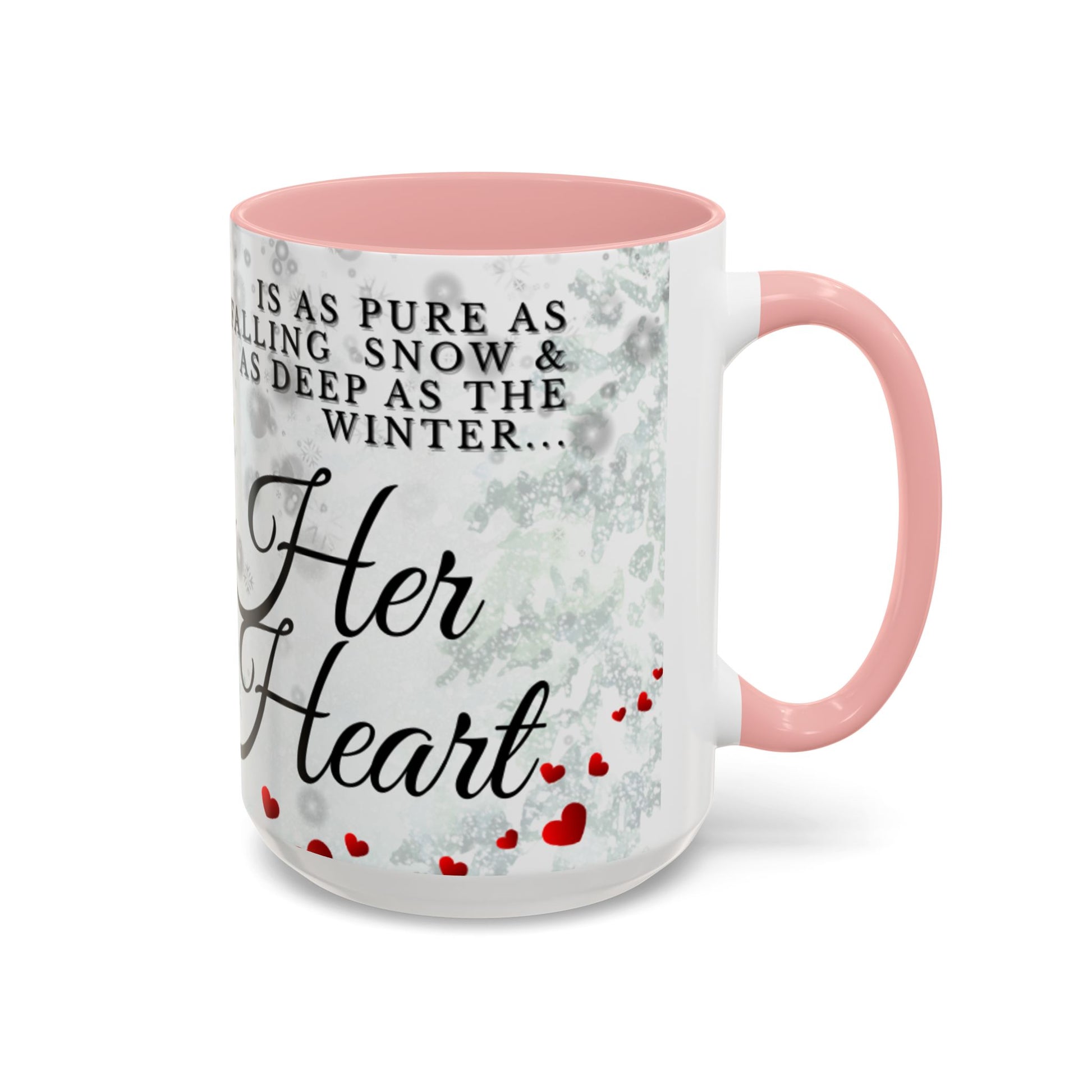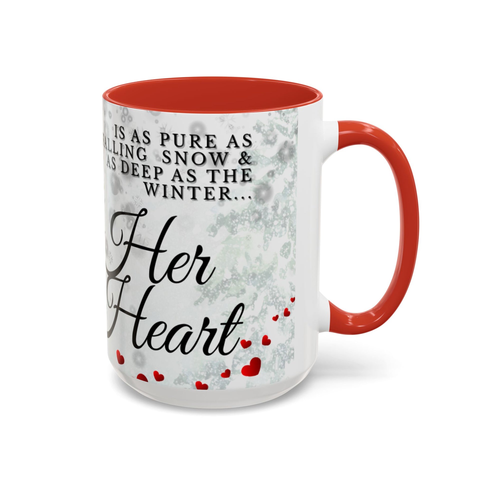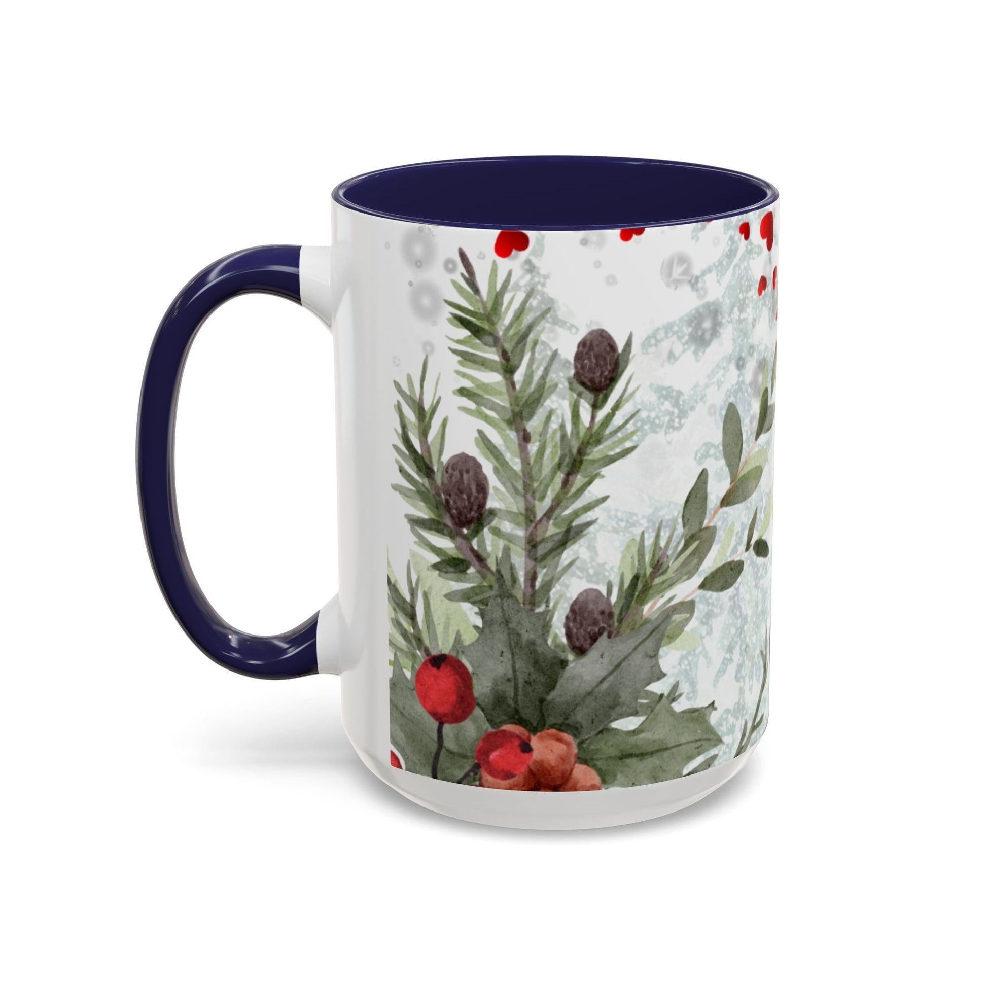 This ceramic accent mug brings a cozy, wintry moment to every sip. A soft snowflake texture and delicate sprigs wrap around hand-lettered text, while tiny scattered hearts add a quiet warmth. The colored interior and handle create a striking contrast against the glossy white exterior, making the design feel both elegant and comforting. Sized for morning routines or long afternoons at the desk, it holds either 11oz or 15oz and stands up to daily use with dishwasher- and microwave-safe durability. Lead- and BPA-free glazing ensures safe enjoyment of hot drinks during quiet winter mornings or heartfelt gatherings.
